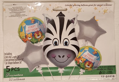 W skład zestawu wchodzą: 1szt. balon zebra 90cm, 2szt. balon okrągły 45cm, 2szt. balon gwiazdka 45cm