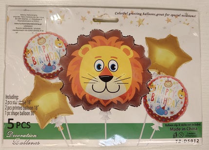 W skład zestawu wchodzą: 1szt. balon foliowy lew 76cm, 2szt. balon foliowy gwiazdki 45cm, 2szt. balon foliowy okrągły 45cm
