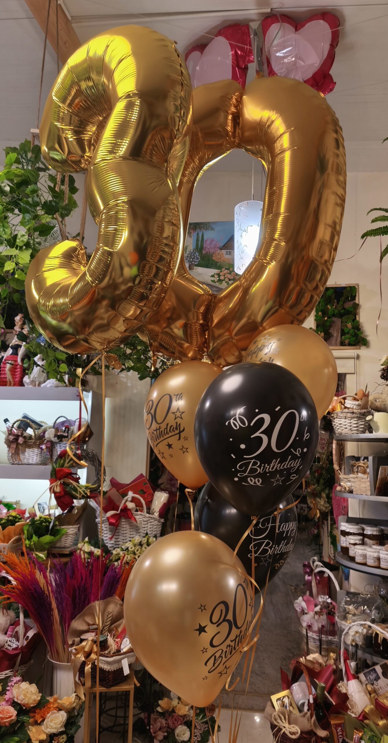 Elegancki zestaw złoto czarnych balonów napełnionych helem na 30 urodziny. Zestaw zawiera 2 duże cyfry foliowe w kolorze złotym o wymiarze 92cm,5 balonów lateksowych złoto czarnych z nadrukiem 30 Birthday (30 urodziny).Balony napełnione są helem, który powoduje, że balony unoszą się w powietrzu. Balony wiązane są tasiemką do balonów w kolorze złotym, przywiązane do specjalnych obciążników, które to utrzymują balony na wybranym poziomie i w wybranym miejscu. Taki zestaw balonów urodzinowych to super prezent oraz efektowna dekoracja w domu badż sali urodzinowej z efektem WOW.