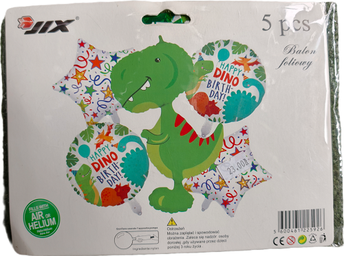 W skład zestawu wchodzą: 1szt. balon foliowy dinozaur 90cm x 45cm, 2szt. balon foliowy okrągły 40cm, 2szt. balon foliowy gwiazdka 40cm