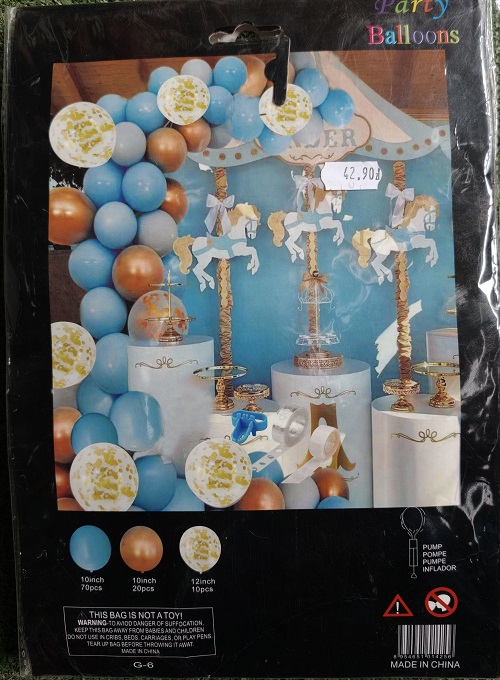 W skład zestawu wchodzą: 70 szt. balon niebieski 25cm, 20szt. balon złoty 25cm, 10szt. balon konfetti 33cm