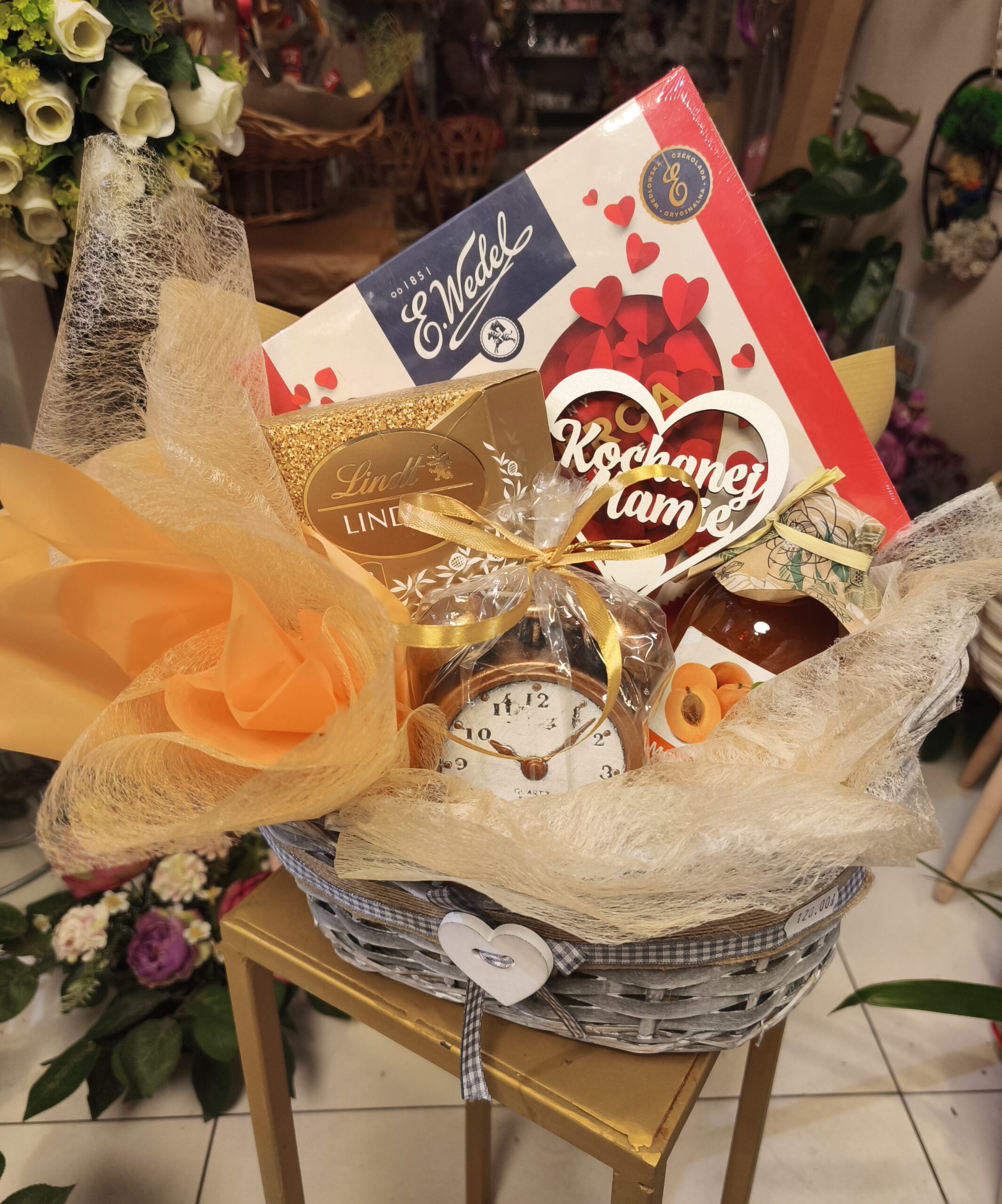 Elegancki zestaw prezentowy dla mamy skomponowany w koszyku wiklinowym udekorowanym wstążką oraz drewnianym białym serduszkiem. Zestaw zawiera łakocie jak i nietuzinkowy prezent, którym jest świeca w kształcie starodawnego budzika, to wspaniały element dekoracyjny do każdego domu na komodę czy nocną szafkę. Polecamy.