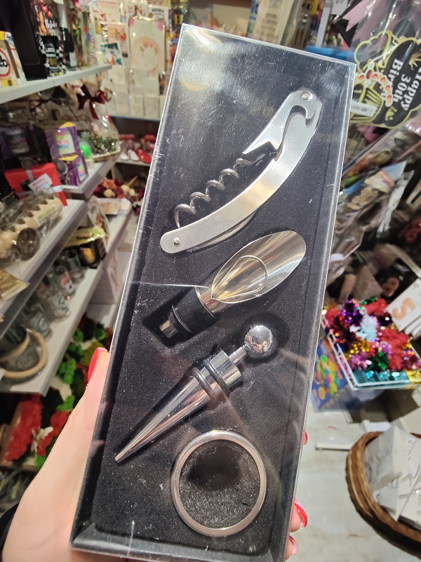 Zestaw do wina. W skład wchodzą: korkociąg, otwieracz, nalewak oraz korek na wino. Idealny prezent na święta czy urodziny. Zapakowany w estetyczne pudełko