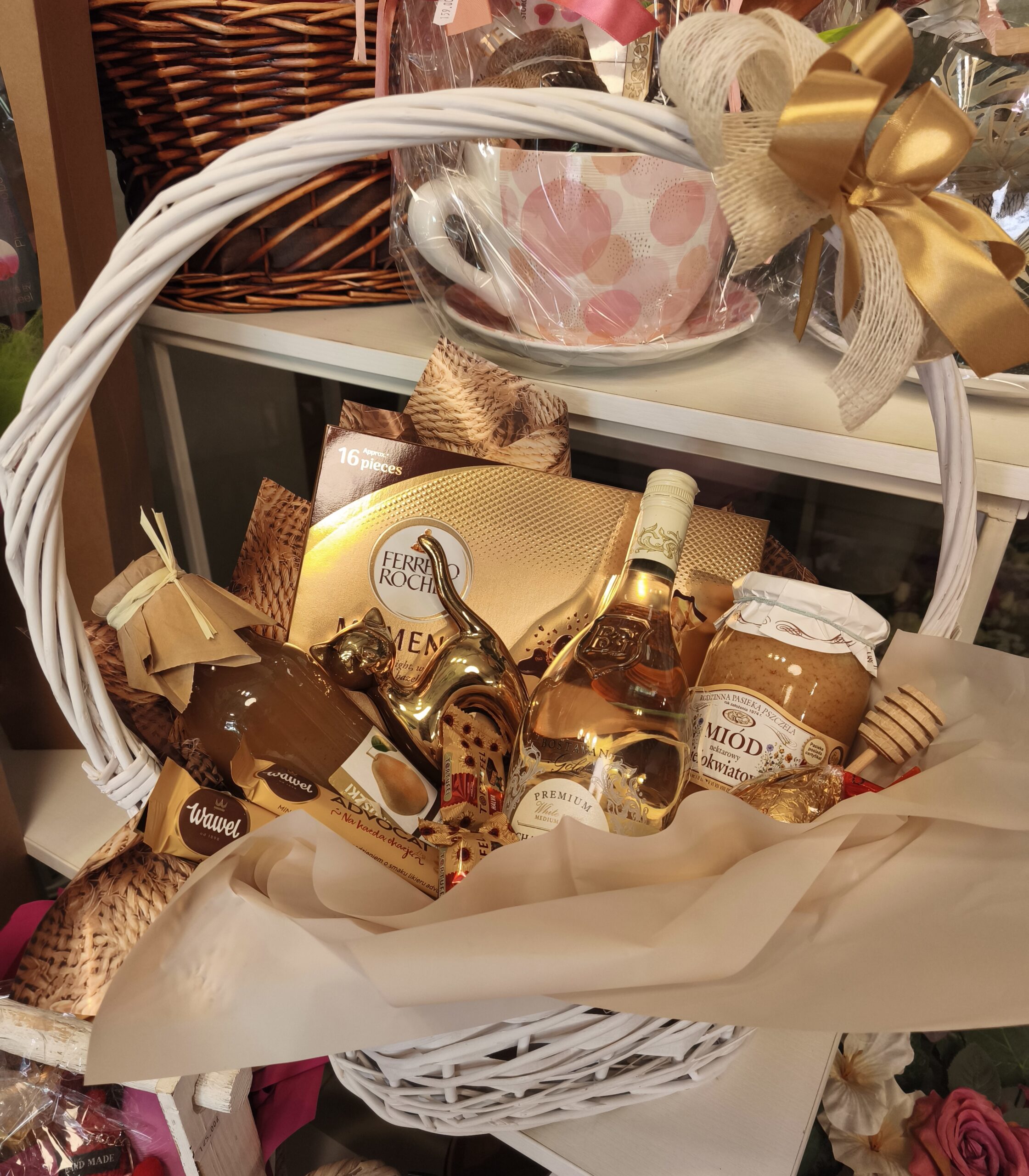 Elegancki kosz prezentowy w naturalnym stylu. Zestaw skomponowany jest z naturalnych produktów z dodatkiem bardzo stylowej butelki białego wina ,wypełniony smakowitymi słodkościami oraz złotą figurką w stylu glamour ,która będzie elegancką dekoracją komody solenizanta/tki oraz pamięcią o Tobie.
