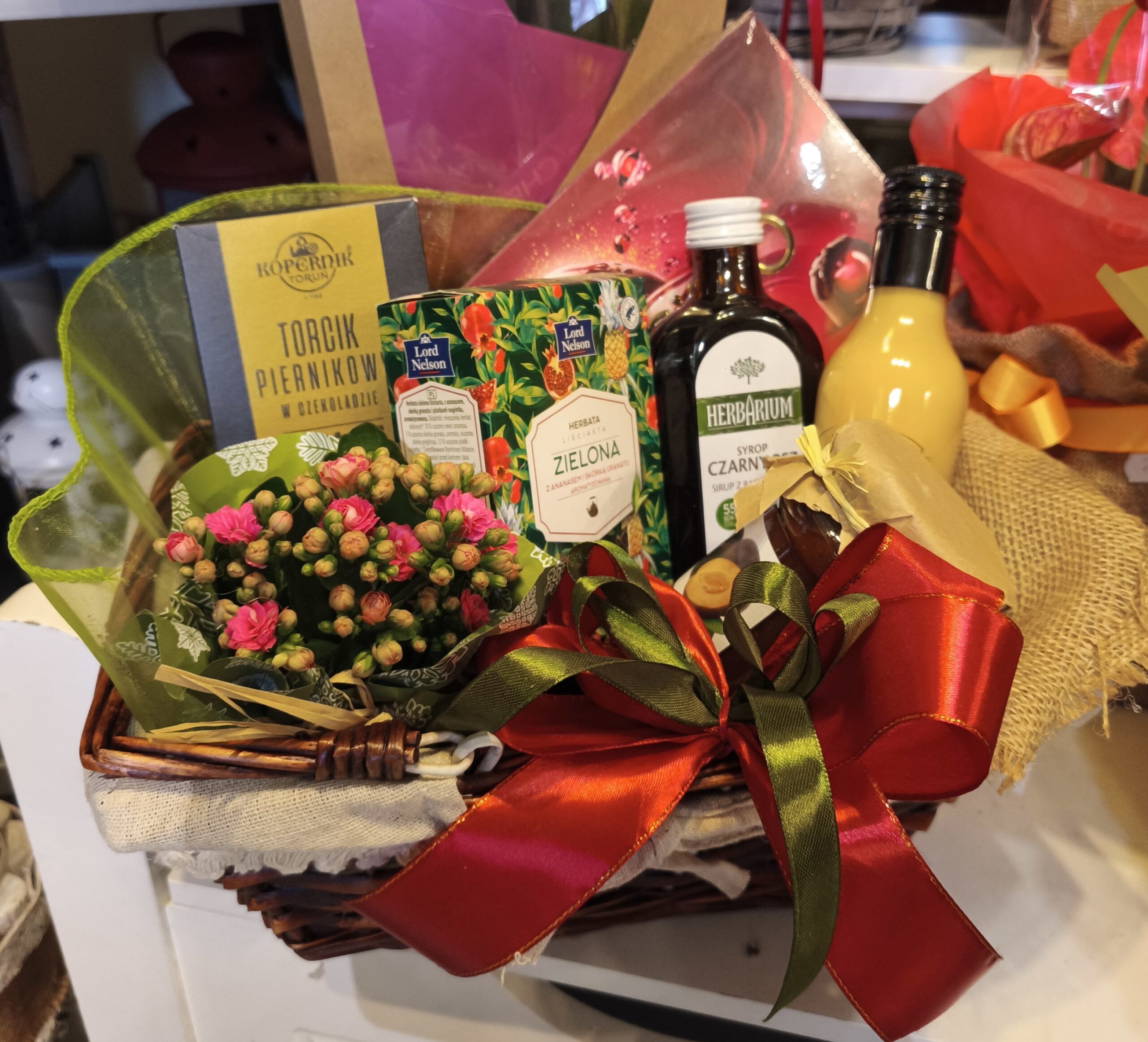 Elegancki zestaw prezentowy gustownie skomponowany z produktów spożywczych oraz kwitnącego kwiatu doniczkowego. Taki zestaw to idealny prezent na wiele okazji np. urodziny ,imieniny ,dla kobiety, mamy ,babci , podziękowania oraz wiele innych okoliczności.