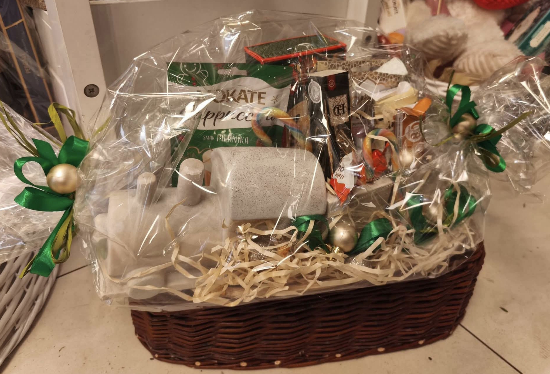 - czekoladki, praliny, pierniki, cukierki – wszystko pięknie zapakowane na podstawce w folię prezentową, udekorowane naturalnymi dodatkami ,bąbkami i zielonymi wstążkami. Idealny prezent pod choinkę dla dzieci, młodzieży i dorosłych .