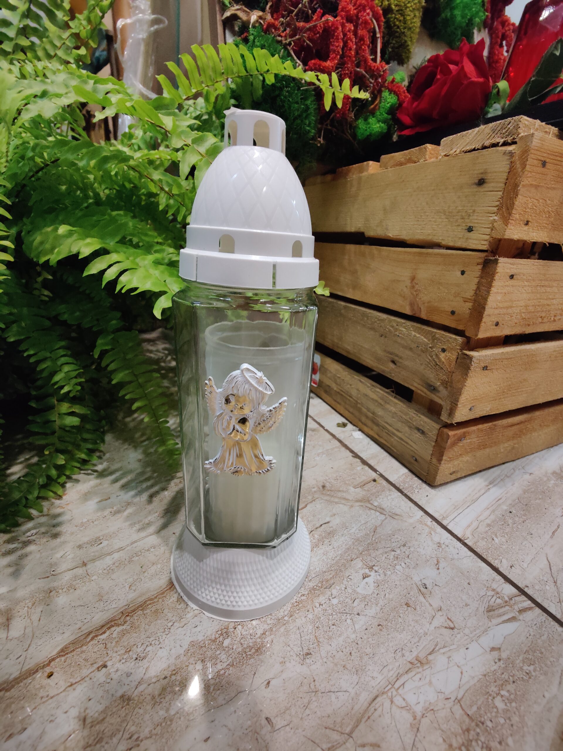 Znicz przeznaczony dla dzieci, co podkreśla jego delikatny i symboliczny design. Posiada przezroczystą, sześciokątną obudowę ze szklanym wkładem. Na froncie znicza umieszczona jest dekoracyjna figurka aniołka z aureolą, wykonana w złotym kolorze, co nadaje mu łagodnego i pocieszającego charakteru.