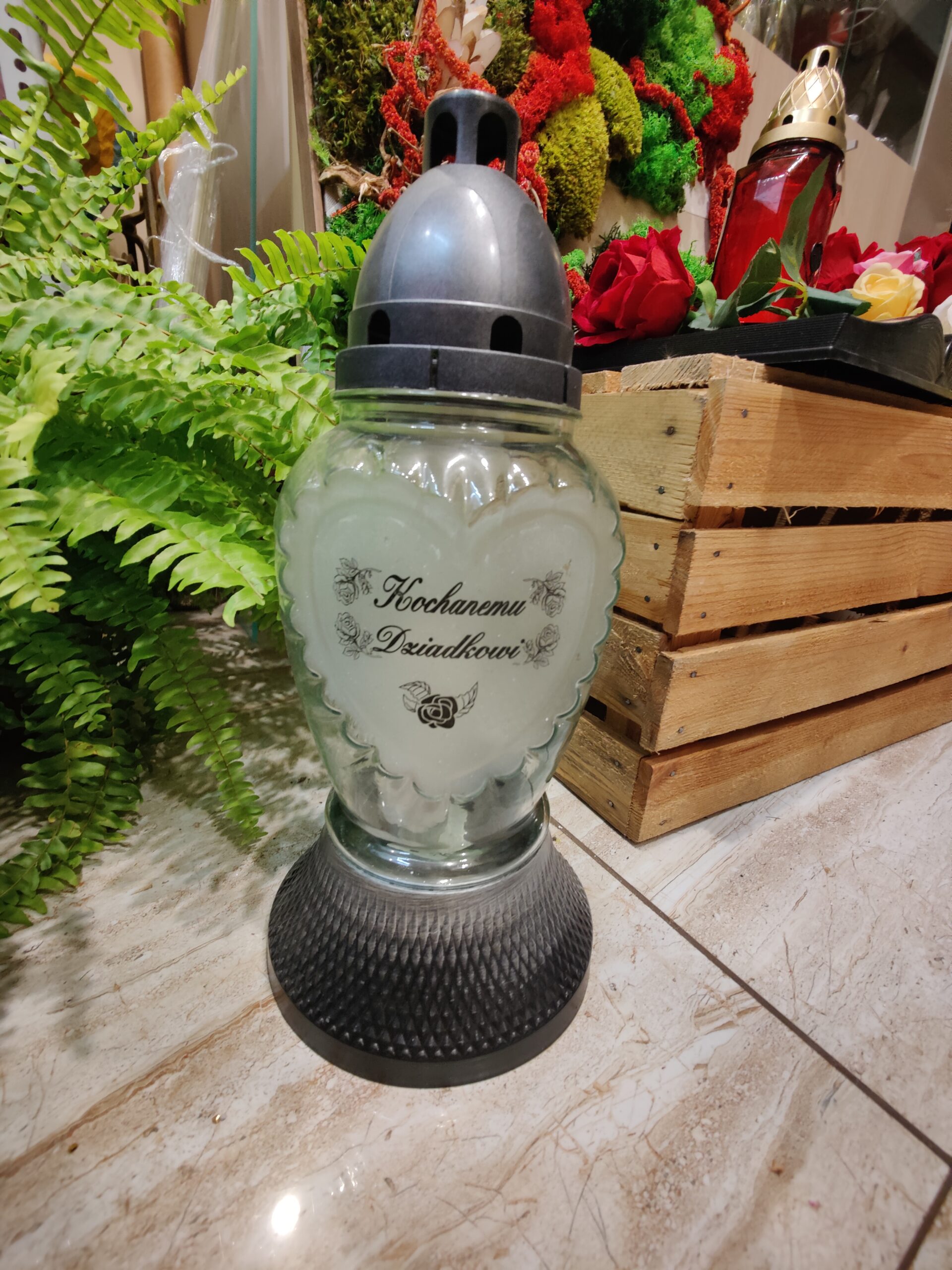 Znicz z dedykacją ” Kochanemu Dziadkowi ” – srebrne zdobienia z czarnymi kwiatami