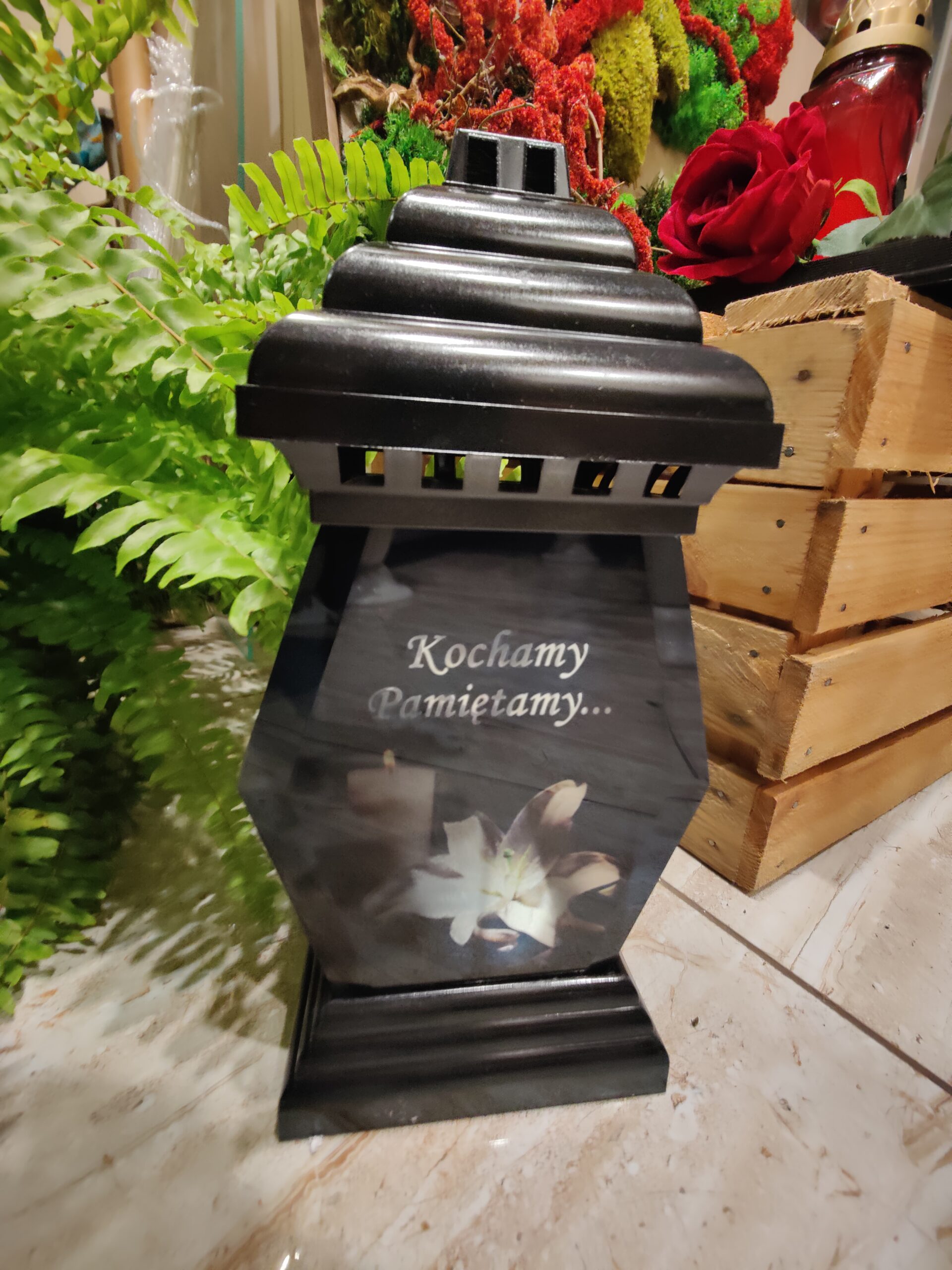 Podstawka oraz kapturek wykonany z plastiku w kolorze czarnym, dedykacja na jednej ściance znicza