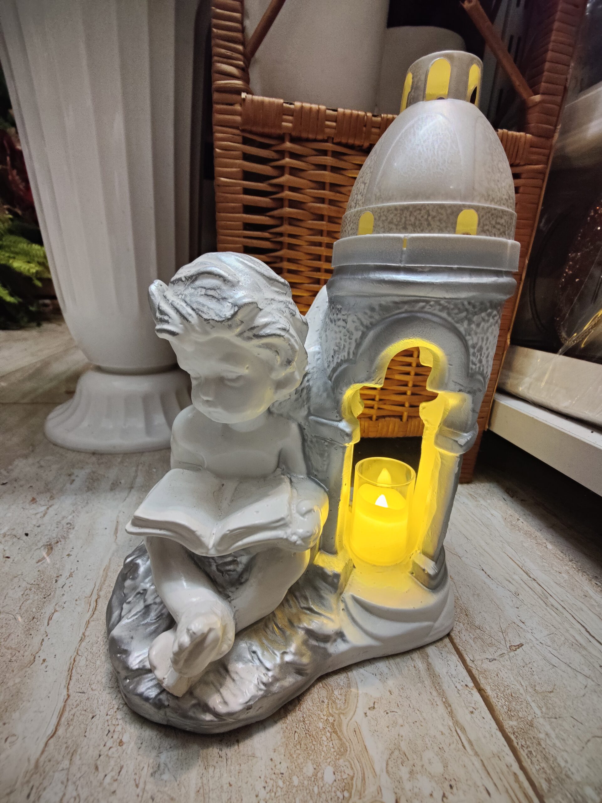 Znicz z aniołkiem wykonany z gipsu, który został zaimpregnowany. Można go malować. Zachwyca oryginalnym wyglądem. Świeczka nie jest elementem zestawu