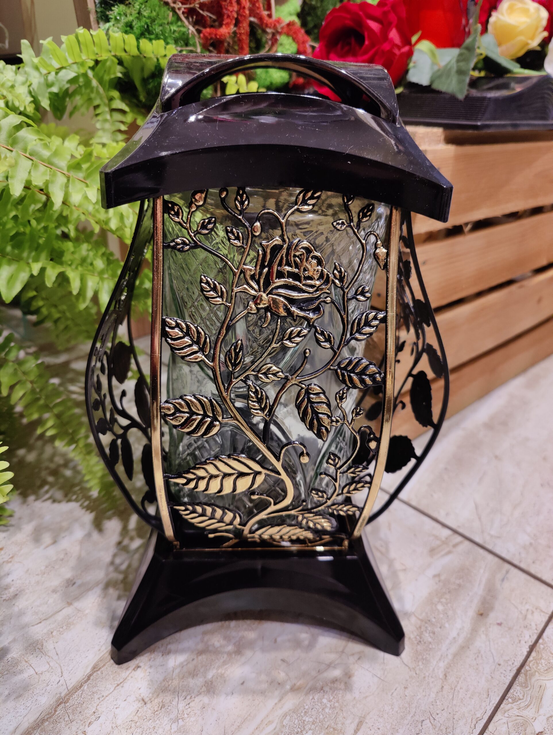 Elegancki znicz dekoracyjny w kształcie kropli, wykonany z czarnego plastiku ze złotymi akcentami. Szklane panele zdobione są motywem róż i liści, z uchwytem na górze