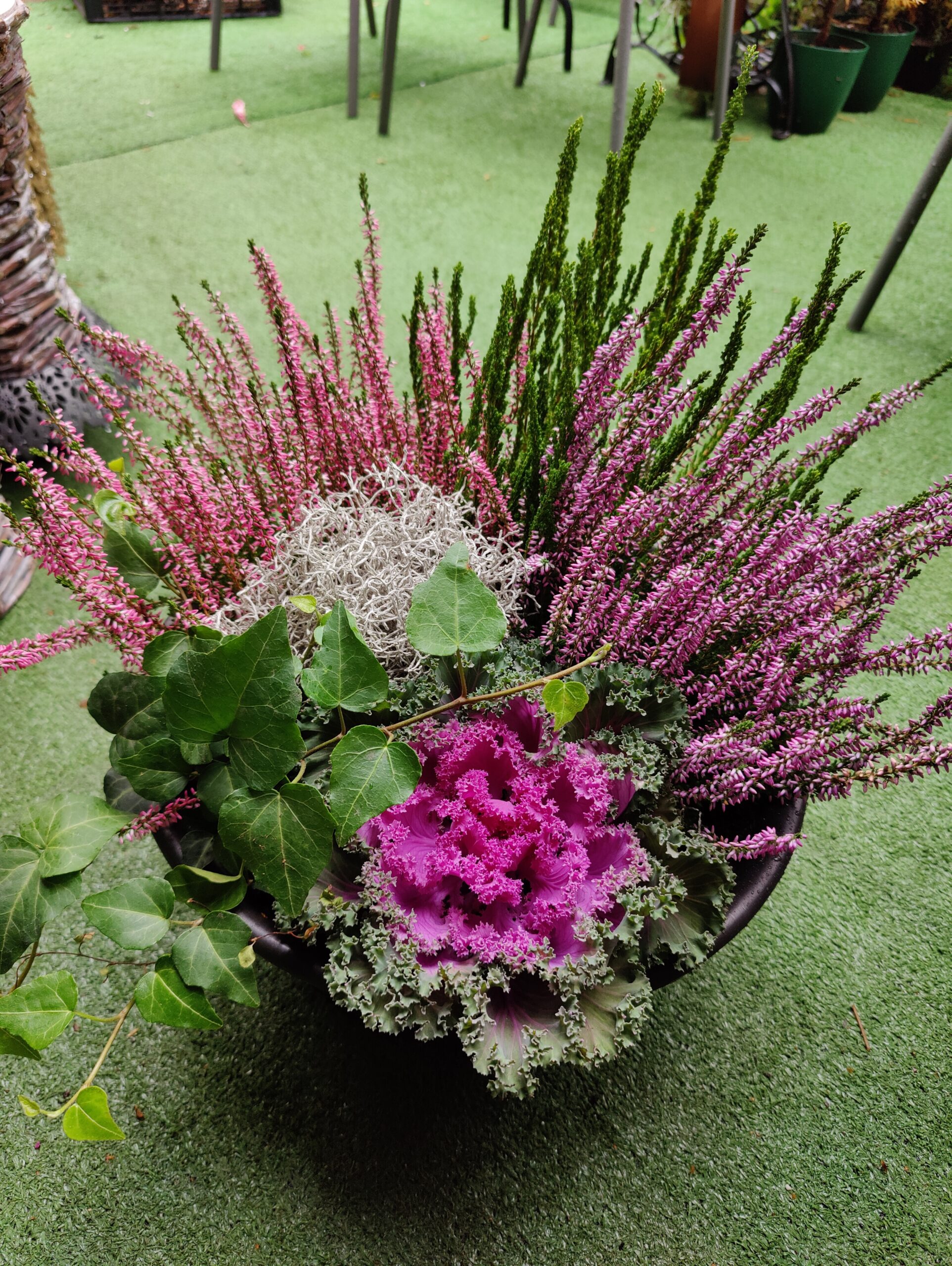 Ta urokliwa kompozycja zachwyca intensywnymi odcieniami różu i zieleni. Połączenie wrzosów, jarmużu ozdobnego i liści bluszczu tworzy pełną życia dekoracje. Idealna do ogrodu, tarasu lub nagrobka – dodaj elegancji swojemu otoczeniu